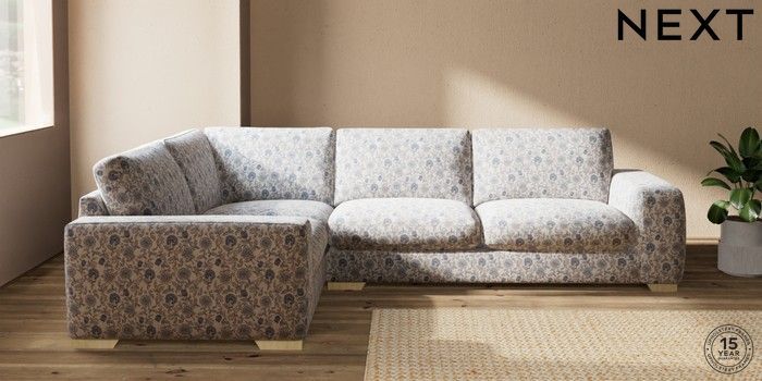 7.3.1 Buy Houghton Deep Sit Large Corner Sofa - Left Hand Relaxed Linen Look Print Woodblock Floral Blue Large Square Angle - Light from the Next UK online shop Click here to use our accessible website