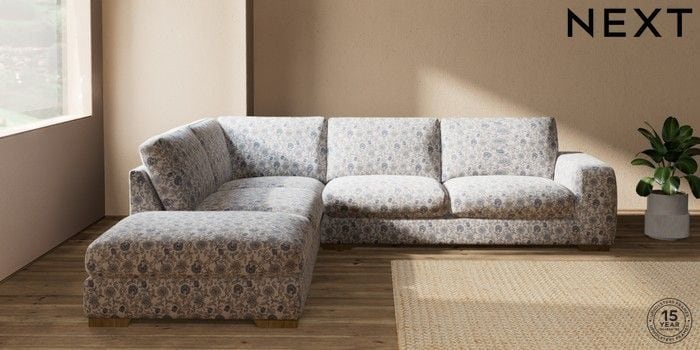 7.3.1 Buy Houghton Deep Sit Large Open End Corner Chaise - Left Hand Relaxed Linen Look Print Woodblock Floral Blue Large Square Angle - Mid from the Next UK online shop Click here to use our accessible website