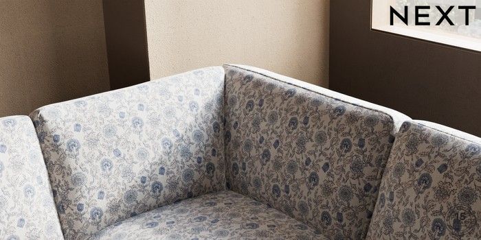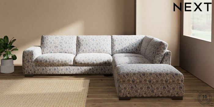 7.3.1 Buy Houghton Deep Sit Large Open End Corner Chaise - Right Hand Relaxed Linen Look Print Woodblock Floral Blue Large Square Angle - Gunmetal from the Next UK online shop