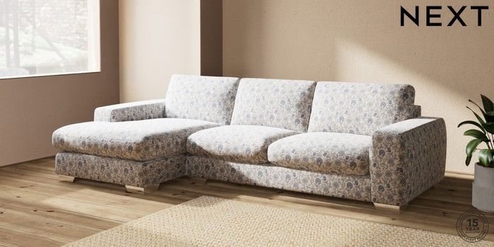 7.3.1 Buy Houghton Deep Sit Large Sofa Chaise - Left Hand Relaxed Linen Look Print Woodblock Floral Blue Large Square Angle - Chrome Metal from the Next UK online shop Click here to use our accessible website