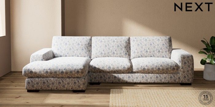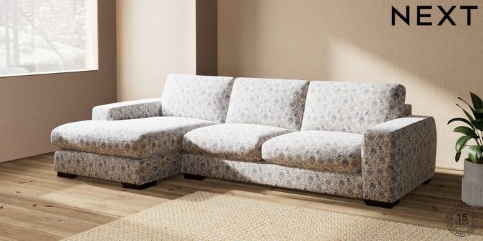 7.3.1 Buy Houghton Deep Sit Large Sofa Chaise - Left Hand Relaxed Linen Look Print Woodblock Floral Blue Large Square Angle - Dark from the Next UK online shop Click here to use our accessible website