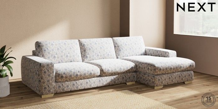 7.3.1 Buy Houghton Deep Sit Large Sofa Chaise - Right Hand Relaxed Linen Look Print Woodblock Floral Blue Large Square Angle - Light from the Next UK online shop Click here to use our accessible website