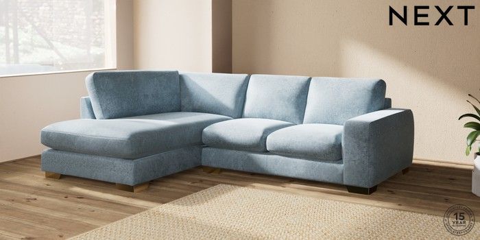 7.2.6 Buy Houghton Deep Sit Medium Corner Chaise - Left Hand Plush Chenille Light Blue Large Square Angle - Brushed Brass from the Next UK online shop Click here to use our accessible website