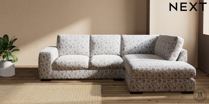 7.3.1 Buy Houghton Deep Sit Medium Corner Chaise - Right Hand Relaxed Linen Look Print Woodblock Floral Blue Large Square Angle - Dark from the Next UK online shop Click here to use our accessible website