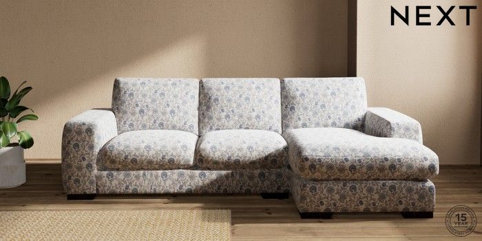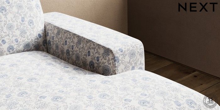 7.3.1 Buy Houghton Deep Sit Medium Sofa Chaise - Right Hand Relaxed Linen Look Print Woodblock Floral Blue Large Square Angle - Dark from the Next UK online shop Click here to use our accessible website