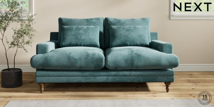 6.12.1 Buy Hutton Deep Relaxed Sit 3 Seater Small Sofa Chunky Chenille Mid Teal Green Country Turned - Mid from the Next UK online shop Click here to use our accessible website