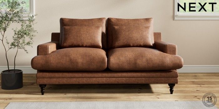 6.12.1 Buy Hutton Deep Relaxed Sit 3 Seater Small Sofa Monza Faux Leather Easy Clean Chestnut Brown Country Turned - Dark from the Next UK online shop Click here to use our accessible website