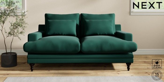 6.12.1 Buy Hutton Deep Relaxed Sit 3 Seater Small Sofa Plush Velvet Easy Clean Bottle Green Country Turned - Dark from the Next UK online shop Click here to use our accessible website