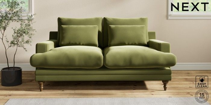 6.12.1 Buy Hutton Deep Relaxed Sit 3 Seater Small Sofa Plush Velvet Easy Clean Mid Olive Green Country Turned - Mid from the Next UK online shop Click here to use our accessible website