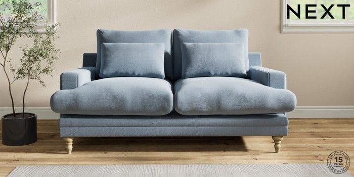 6.12.1 Buy Hutton Deep Relaxed Sit 3 Seater Small Sofa Relaxed Linen Look Mid Blue Country Turned - Light from the Next UK online shop Click here to use our accessible website