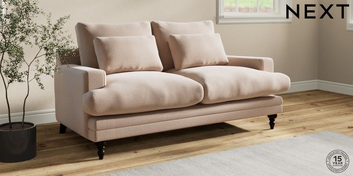 7.0.3 Buy Hutton Deep Relaxed Sit 3 Seater Small Sofa Relaxed Linen Look Mid Natural Country Turned - Dark from the Next UK online shop Click here to use our accessible website
