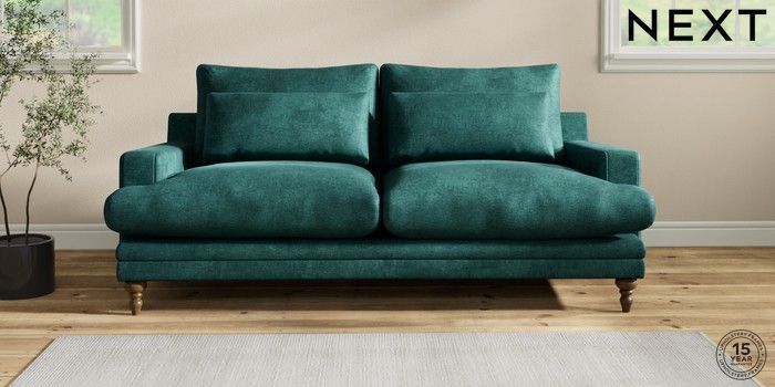 6.12.1 Buy Hutton Deep Relaxed Sit 3 Seater Sofa Plush Chenille Dark Teal Green Country Turned - Mid from the Next UK online shop Click here to use our accessible website