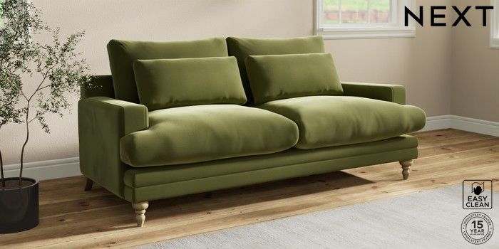 7.0.3 Buy Hutton Deep Relaxed Sit 3 Seater Sofa Plush Velvet Easy Clean Mid Olive Green Country Turned - Light from the Next UK online shop Click here to use our accessible website