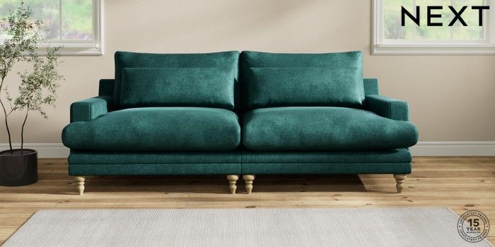 6.12.1 Buy Hutton Deep Relaxed Sit 4 Seater Sofa Plush Chenille Dark Teal Green Country Turned - Light from the Next UK online shop Click here to use our accessible website