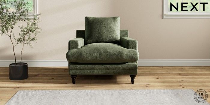 6.12.1 Buy Hutton Deep Relaxed Sit Armchair Boucle Chenille Dark Moss Green Country Turned - Dark from the Next UK online shop Click here to use our accessible website