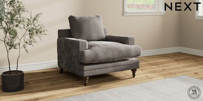 7.0.3 Buy Hutton Deep Relaxed Sit Armchair Distressed Velour French Grey Country Turned - Mid from the Next UK online shop Click here to use our accessible website