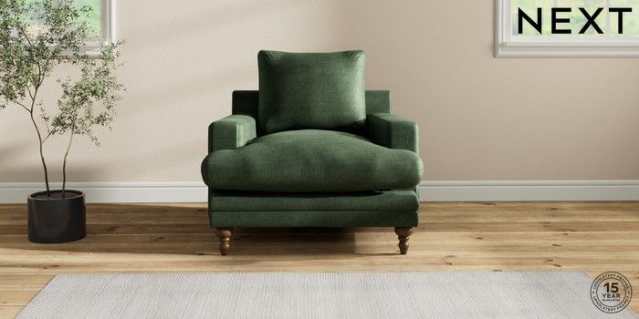 6.12.1 Buy Hutton Deep Relaxed Sit Armchair Luxe Chenille Dark Green Country Turned - Mid from the Next UK online shop Click here to use our accessible website