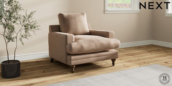 7.0.3 Buy Hutton Deep Relaxed Sit Armchair Luxe Chenille Mid Natural Country Turned - Mid from the Next UK online shop Click here to use our accessible website
