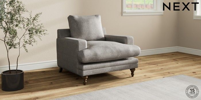 7.0.3 Buy Hutton Deep Relaxed Sit Armchair Plush Chenille Light Grey Country Turned - Mid from the Next UK online shop Click here to use our accessible website