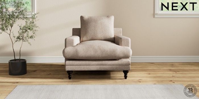 6.12.1 Buy Hutton Deep Relaxed Sit Armchair Tweedy Chenille Mid Natural Country Turned - Dark from the Next UK online shop Click here to use our accessible website