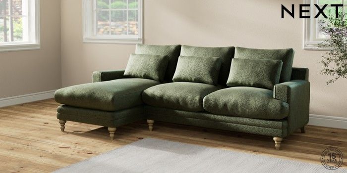 6.12.1 Buy Hutton Deep Relaxed Sit Medium Sofa Chaise - Left Hand Boucle Chenille Dark Moss Green Country Turned - Light from the Next UK online shop Click here to use our accessible website