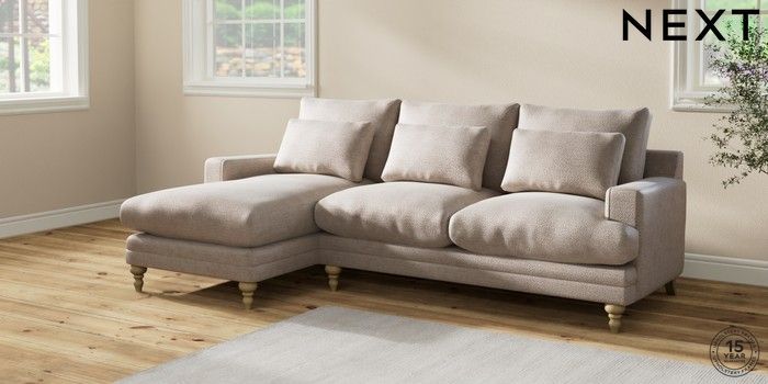 6.12.1 Buy Hutton Deep Relaxed Sit Medium Sofa Chaise - Left Hand Boucle Chenille Light Natural Country Turned - Light from the Next UK online shop Click here to use our accessible website