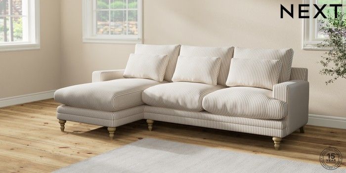 6.12.1 Buy Hutton Deep Relaxed Sit Medium Sofa Chaise - Left Hand Chenille Stripe Natural Country Turned - Light from the Next UK online shop Click here to use our accessible website