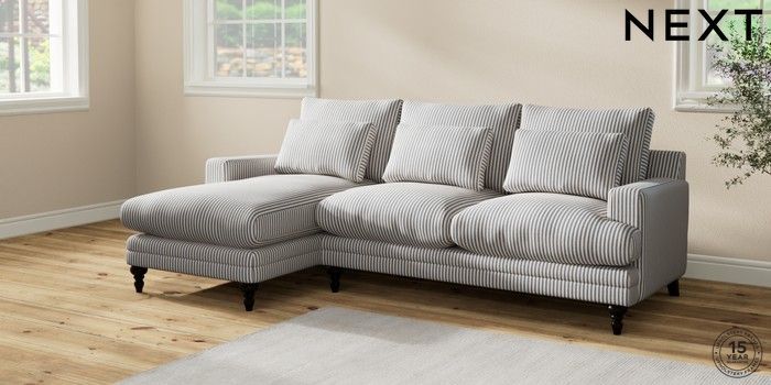 6.12.1 Buy Hutton Deep Relaxed Sit Medium Sofa Chaise - Left Hand Chenille Stripe Slate Blue Country Turned - Dark from the Next UK online shop Click here to use our accessible website