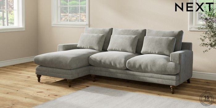 6.12.1 Buy Hutton Deep Relaxed Sit Medium Sofa Chaise - Left Hand Chunky Chenille Light Grey Country Turned - Mid from the Next UK online shop Click here to use our accessible website