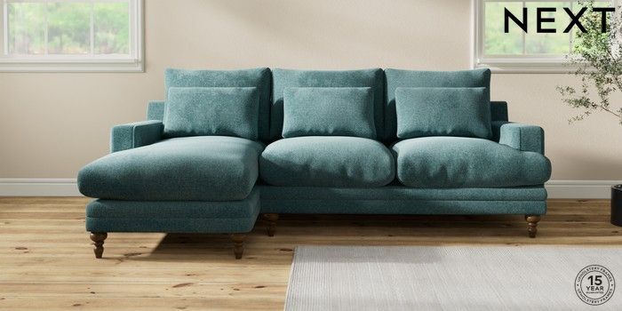 7.0.3 Buy Hutton Deep Relaxed Sit Medium Sofa Chaise - Left Hand Chunky Chenille Mid Teal Green Country Turned - Mid from the Next UK online shop Click here to use our accessible website