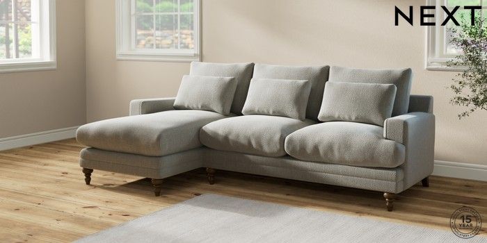 6.12.1 Buy Hutton Deep Relaxed Sit Medium Sofa Chaise - Left Hand Chunky Texture Dove Country Turned - Mid from the Next UK online shop Click here to use our accessible website