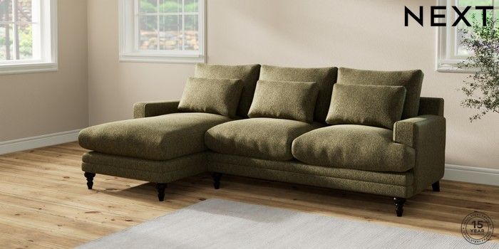6.12.1 Buy Hutton Deep Relaxed Sit Medium Sofa Chaise - Left Hand Cotswold Chenille Dark Green Country Turned - Dark from the Next UK online shop Click here to use our accessible website
