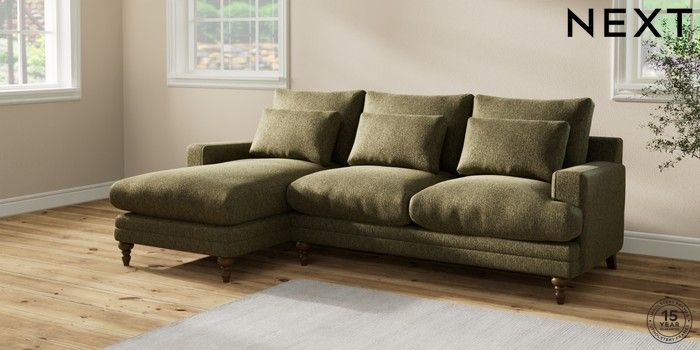6.12.1 Buy Hutton Deep Relaxed Sit Medium Sofa Chaise - Left Hand Cotswold Chenille Dark Green Country Turned - Mid from the Next UK online shop Click here to use our accessible website