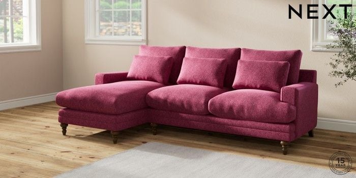 6.12.1 Buy Hutton Deep Relaxed Sit Medium Sofa Chaise - Left Hand Cotswold Chenille Dark Raspberry Pink Country Turned - Mid from the Next UK online shop Click here to use our accessible website