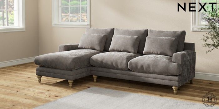 6.12.1 Buy Hutton Deep Relaxed Sit Medium Sofa Chaise - Left Hand Distressed Velour French Grey Country Turned - Light from the Next UK online shop Click here to use our accessible website