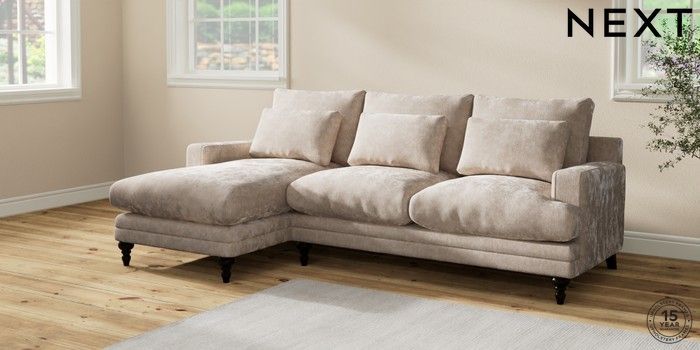 6.12.1 Buy Hutton Deep Relaxed Sit Medium Sofa Chaise - Left Hand Distressed Velour Mid Natural Country Turned - Dark from the Next UK online shop Click here to use our accessible website