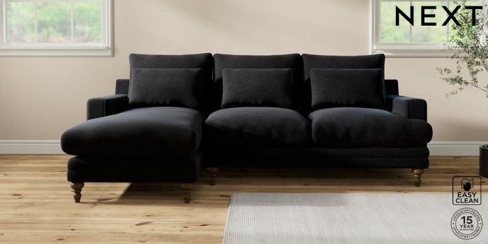7.0.3 Buy Hutton Deep Relaxed Sit Medium Sofa Chaise - Left Hand Fine Chenille Easy Clean Black Country Turned - Mid from the Next UK online shop Click here to use our accessible website
