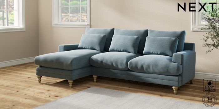 6.12.1 Buy Hutton Deep Relaxed Sit Medium Sofa Chaise - Left Hand Fine Chenille Easy Clean Mid Blue Country Turned - Light from the Next UK online shop Click here to use our accessible website