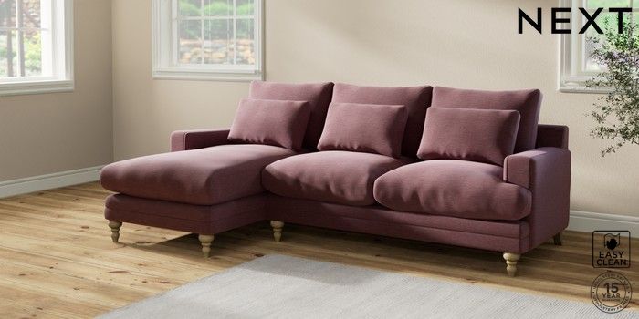 6.12.1 Buy Hutton Deep Relaxed Sit Medium Sofa Chaise - Left Hand Fine Chenille Easy Clean Mid Mulberry Purple Country Turned - Light from the Next UK online shop Click here to use our accessible website