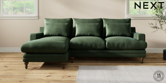 7.0.3 Buy Hutton Deep Relaxed Sit Medium Sofa Chaise - Left Hand Luxe Chenille Dark Green Country Turned - Mid from the Next UK online shop Click here to use our accessible website