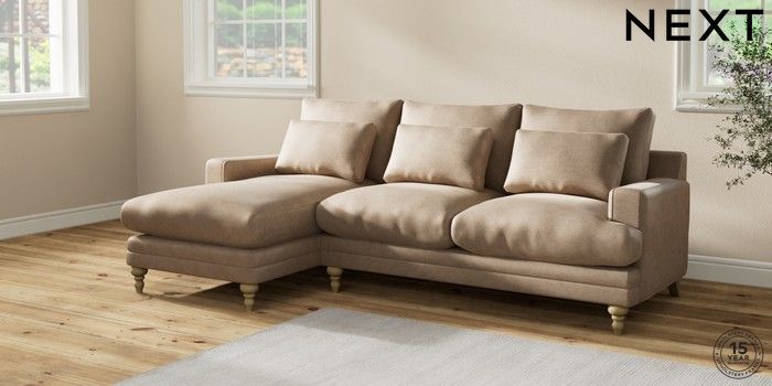 6.12.1 Buy Hutton Deep Relaxed Sit Medium Sofa Chaise - Left Hand Luxe Chenille Mid Camel Beige Country Turned - Light from the Next UK online shop Click here to use our accessible website