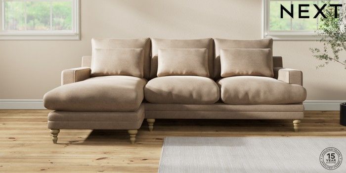 7.0.3 Buy Hutton Deep Relaxed Sit Medium Sofa Chaise - Left Hand Luxe Chenille Mid Camel Beige Country Turned - Light from the Next UK online shop Click here to use our accessible website