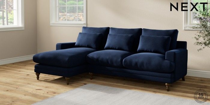 6.12.1 Buy Hutton Deep Relaxed Sit Medium Sofa Chaise - Left Hand Luxe Chenille Navy Blue Country Turned - Mid from the Next UK online shop Click here to use our accessible website