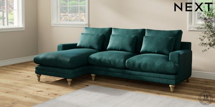 6.12.1 Buy Hutton Deep Relaxed Sit Medium Sofa Chaise - Left Hand Plush Chenille Dark Teal Green Country Turned - Light from the Next UK online shop Click here to use our accessible website