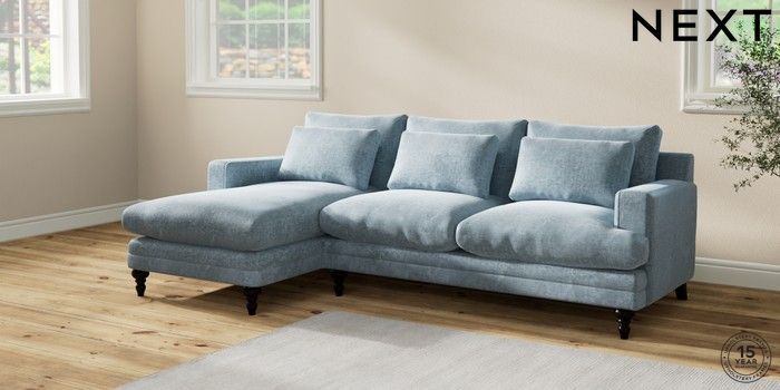 7.2.6 Buy Hutton Deep Relaxed Sit Medium Sofa Chaise - Left Hand Plush Chenille Light Blue Country Turned - Dark from the Next UK online shop Click here to use our accessible website
