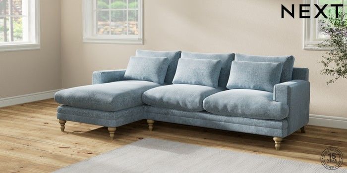 7.2.6 Buy Hutton Deep Relaxed Sit Medium Sofa Chaise - Left Hand Plush Chenille Light Blue Country Turned - Light from the Next UK online shop Click here to use our accessible website