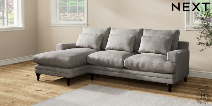 6.12.1 Buy Hutton Deep Relaxed Sit Medium Sofa Chaise - Left Hand Plush Chenille Light Grey Country Turned - Dark from the Next UK online shop Click here to use our accessible website