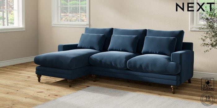 6.12.1 Buy Hutton Deep Relaxed Sit Medium Sofa Chaise - Left Hand Plush Velvet Easy Clean Airforce Blue Country Turned - Mid from the Next UK online shop Click here to use our accessible website