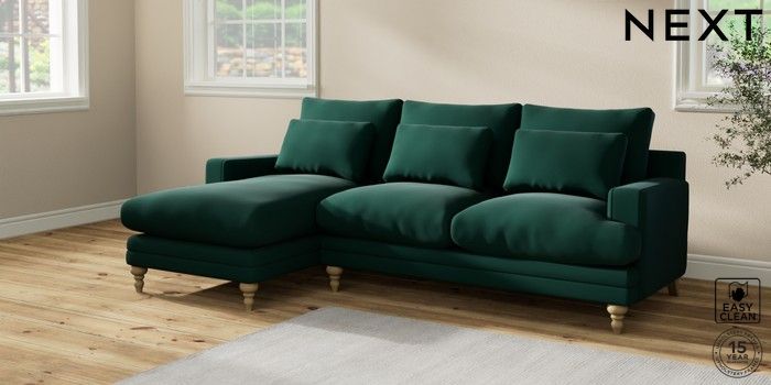 6.12.1 Buy Hutton Deep Relaxed Sit Medium Sofa Chaise - Left Hand Plush Velvet Easy Clean Bottle Green Country Turned - Light from the Next UK online shop Click here to use our accessible website