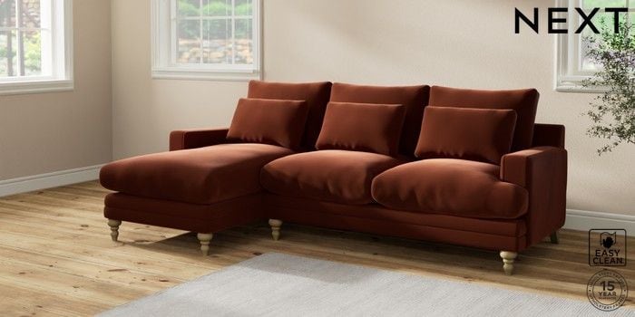6.12.1 Buy Hutton Deep Relaxed Sit Medium Sofa Chaise - Left Hand Plush Velvet Easy Clean Ginger Orange Country Turned - Light from the Next UK online shop Click here to use our accessible website